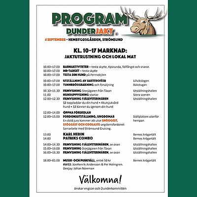 Det blir ”knallar” där man kan handla jaktprylar, kött och allt annat man behöver inför jakten samt ett öltält med god mat och dryck. På kvällen bjuds det på livemusik.
