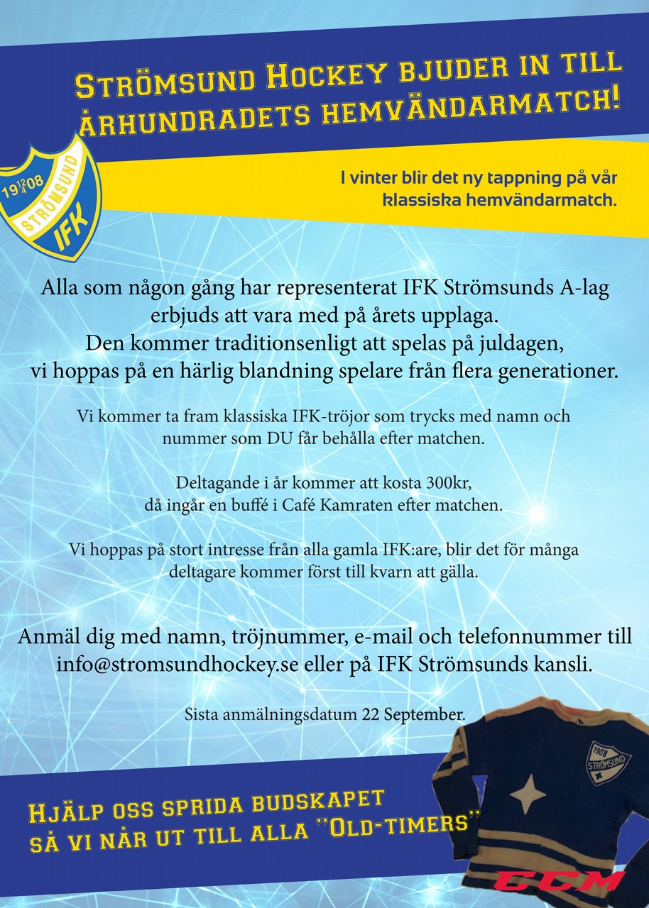 Ni som vill vara med på matchen kommer även att få möjlighet att komplettera upp er utrustning med nya, fina grejer från CCM. Via Sportringen kommer ni att få 50% rabatt inför detta event!